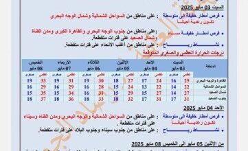 وتشير التوقعات إلى فرص أمطار خفيفة إلى متوسطة، تكون رعدية أحيانًا، على مناطق من السواحل الشمالية وشمال الوجه البحري. كما توجد فرص أمطار خفيفة مساءً على مناطق من القاهرة الكبرى وجنوب الوجه البحري ومدن القناة وشمال الصعيد، مع نشاط رياح على أغلب الأنحاء على فترات متقطعة.