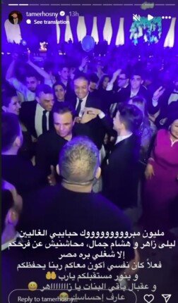 خرج تامر حسني عن صمته ليضع حداً للتكهنات، حيث نشر عبر حسابه الرسمي على إنستجرام رسالة تهنئة للعروسين، كاشفاً عن سبب غيابه. أوضح النجم أنه خارج مصر لانشغاله بالعمل، معبراً عن أسفه لعدم تمكنه من حضور حفل الزفاف، متمنياً لهما حياة زوجية سعيدة.