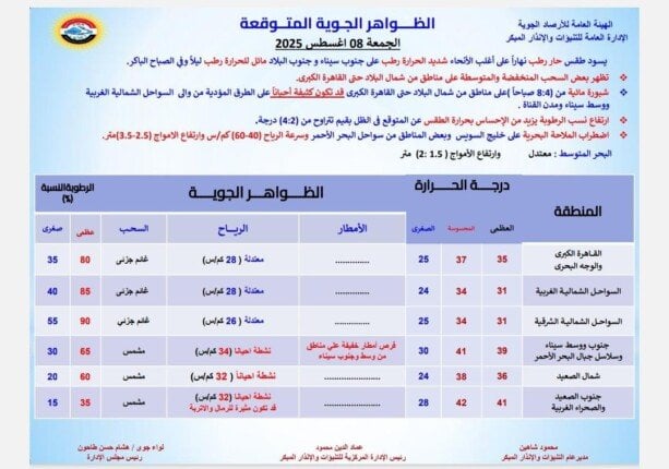 توقعت الهيئة العامة للأرصاد الجوية، أن يسود اليوم الجمعة 8 أغسطس 2025، طقس حار رطب على القاهرة الكبرى والوجه البحري، وشديدة الحرارة على جنوب البلاد.