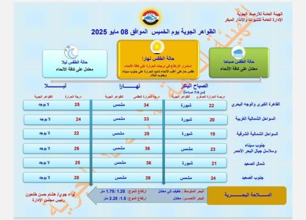 تشهد مصر اليوم الخميس 8 مايو 2025 ارتفاعًا تدريجيًا في درجات الحرارة على أغلب الأنحاء، مع تحذيرات من شبورة مائية صباحًا، وفقًا لتوقعات الهيئة العامة للأرصاد الجوية. يستمر الطقس الحار نهارًا على القاهرة الكبرى والوجه البحري والسواحل الشمالية، بينما يكون شديد الحرارة على جنوب سيناء وجنوب البلاد. أما ليلاً، فيسود طقس معتدل على أغلب الأنحاء.