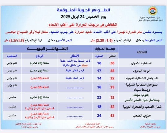 تتوقع الهيئة العامة للأرصاد الجوية انخفاضًا ملحوظًا في درجات الحرارة غدًا الخميس 24 أبريل 2025، ليسود طقس مائل للحرارة على أغلب الأنحاء، وشديد الحرارة على جنوب الصعيد، في حين يسود طقس معتدل ليلاً وفي الصباح الباكر.