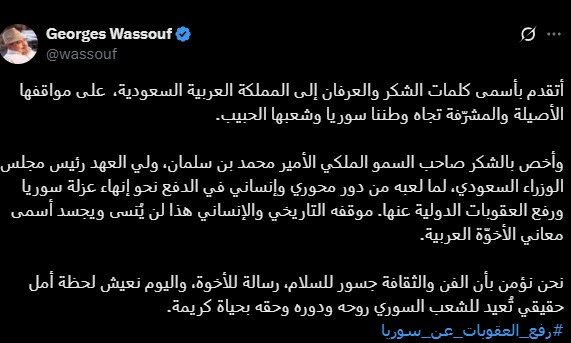 في مشهدٍ يعكس تفاؤلاً حذِراً بمستقبل سوريا، أعرب سلطان الطرب جورج وسوف عن سعادته بقرار رفع العقوبات، موجهاً شكره للمملكة العربية السعودية وولي عهدها الأمير محمد بن سلمان على دورهم المحوري في هذه الخطوة التاريخية.