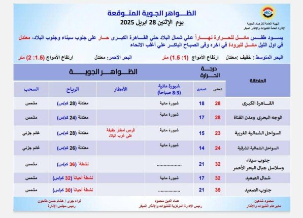 تشهد مصر اليوم الإثنين 28 أبريل 2025، تغيرات في درجات الحرارة وفقًا لتوقعات الهيئة العامة للأرصاد الجوية. نتابع معكم تفاصيل حالة الطقس المتوقعة في مختلف محافظات الجمهورية.