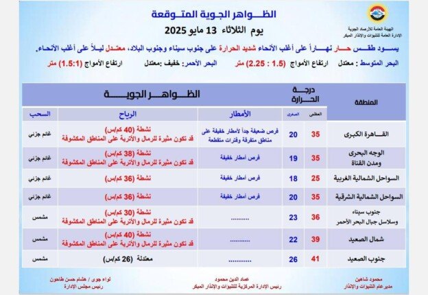 | درجات الحرارة ليوم الثلاثاء 13 مايو 2025 | ||