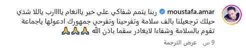 نشر الفنان مصطفى قمر عبر حسابه على إنستجرام رسالة دعم مؤثرة، داعيًا الله أن يتم شفاءها على خير، وأن تعود لتفرح جمهورها بأعمالها الفنية.