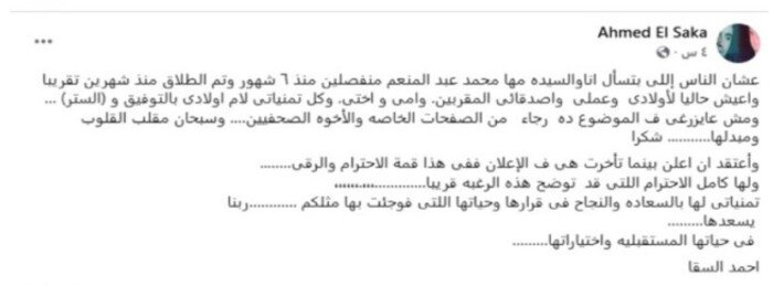 وطلب أحمد السقا من الصحفيين والإعلاميين احترام خصوصيته في هذا الشأن، قائلاً: «مش عايز رغى في الموضوع ده رجاء من الصفحات الخاصة والأخوة الصحفيين. سبحان مقلب القلوب ومبدلها، شكرًا». وأضاف: «لا أريد الحديث كثيراً في هذا الأمر، سبحان مبدل القلوب. أتمنى لها السعادة والنجاح في قرارها وحياتها، وأدعو الله أن يوفقها في حياتها المستقبلية واختياراتها».