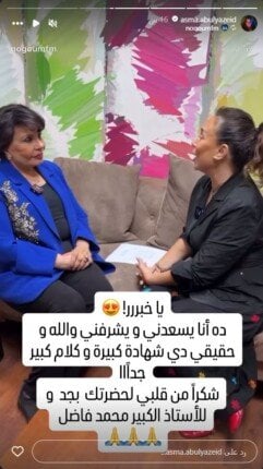 لم تخفِ أسماء أبو اليزيد سعادتها البالغة بهذه الإشادة القيّمة، وعبّرت عن شكرها وامتنانها لفردوس عبدالحميد ومحمد فاضل عبر حسابها على إنستجرام، مؤكدة أن هذه الشهادة تُعتبر كبيرة جدًا بالنسبة لها.
