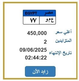 شهدت بوابة مرور مصر الإلكترونية إقبالًا كثيفًا على مزاد اللوحات المعدنية المميزة للسيارات، حيثُ وصل سعر لوحة «ع م و 77» إلى 450 ألف جنيه مصري. ويتنافس على هذه اللوحة حاليًا شخصين، ومن المُنتظر أن يُغلق باب المزايدة غدًا الإثنين الموافق 9 يونيو 2025.
