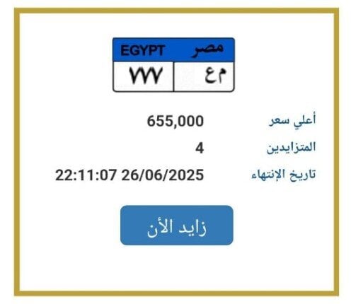 شهدت بوابة مرور مصر الإلكترونية إقبالًا كبيرًا على المزايدة على لوحة معدنية مميزة تحمل رقم «م ع 777»، حيث وصل سعرها إلى 655 ألف جنيه. ويتنافس على هذه اللوحة 4 أشخاص حتى الآن، ومن المقرر أن تُحسم المزايدة غدًا الخميس الموافق 26 يونيو 2025.