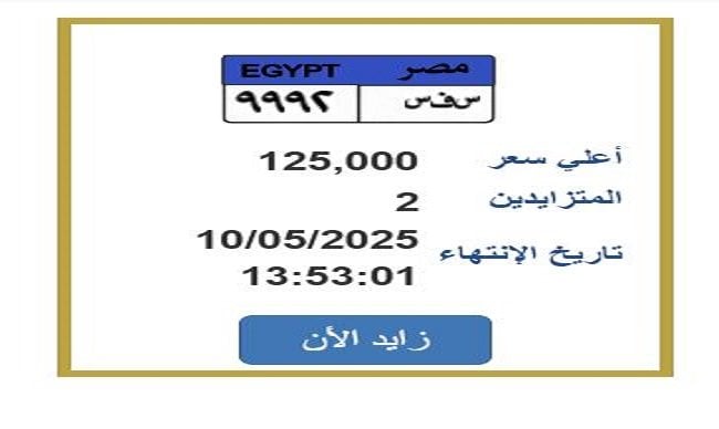 شهدت بوابة مرور مصر الإلكترونية إقبالاً كثيفاً على مزاد لوحة معدنية مميزة للسيارات، حيثُ وصل سعر لوحة تحمل الرقم «س ف س 9992» إلى 125 ألف جنيه مصري. ويتنافس على هذه اللوحة حاليًا شخصان، ومن المُنتظر إسدال الستار على المزاد اليوم السبت الموافق 10 مايو 2025.
