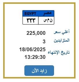 شهد مزاد اللوحات المعدنية المميزة للسيارات على بوابة مرور مصر الإلكترونية إقبالًا كبيرًا، حيث وصل سعر لوحة تحمل رقم «ن م س 333» إلى 225 ألف جنيه. ويتنافس على هذه اللوحة حتى الآن 3 أشخاص، ومن المقرر أن تنتهي المزايدة يوم الأربعاء 18 يونيو 2025.