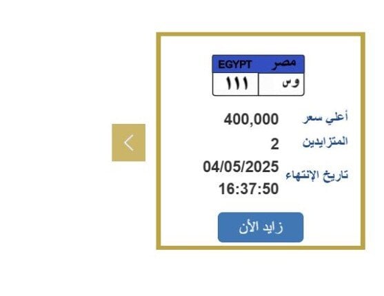 شهدت بوابة مرور مصر الإلكترونية إقبالًا كثيفًا على مزايدة لوحة معدنية مميزة تحمل رقم «و س 111»، حيث تخطى سعرها حاجز الـ400 ألف جنيه مصري. ويتنافس على هذه اللوحة الفريدة شخصان حتى الآن، ومن المقرر أن تُحسم المزايدة اليوم الأحد الموافق 4 مايو 2025.