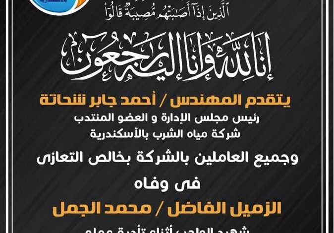 نعت شركة مياه الشرب بالإسكندرية الفقيد، محمد الجمل، في بيان رسمي، مؤكدة أنه لقي حتفه أثناء تأدية عمله، واصفة إياه بـ”شهيد الواجب“. وقد عبّر رئيس الشركة، المهندس أحمد جابر، وجميع العاملين، عن بالغ حزنهم وألمهم لخسارة زميلهم، داعين الله أن يتغمده بواسع رحمته.