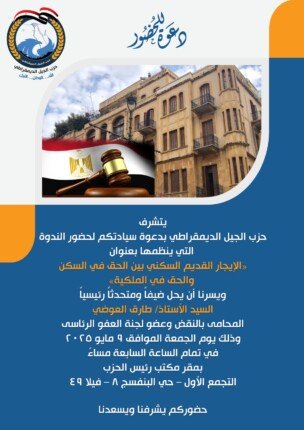 في خطوةٍ تعكس اهتمامًا متزايدًا بقضيةٍ تشغل الرأي العام، وجّه حزب الجيل الديمقراطي دعوةً رسميةً للكاتب الصحفي والإعلامي البارز مصطفى بكري، عضو مجلس النواب، لحضور ندوةٍ هامة تناقش ملف الإيجار القديم.