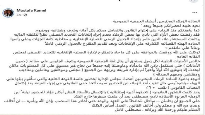 أوضح مصطفى كامل أنه كلف المستشار القانوني علاء الدين عامر بإعداد الجدول الزمني للانتخابات، ومخاطبة جميع الجهات المعنية، وعلى رأسها الهيئة القضائية المشرفة. وأضاف أنه سيقوم ببث قرعة العضوية على الهواء مباشرة، داعيًا أعضاء مجلس الإدارة للحضور، وفي حال تغيب أحدهم سيمارس حقه القانوني في إجراء القرعة.