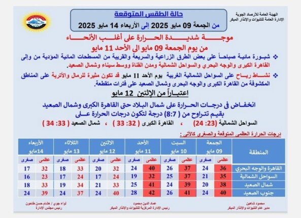 تتأهب مصر لموجة حارة مرتقبة بداية من الجمعة وحتى الأحد، بحسب بيانٍ أصدرته الهيئة العامة للأرصاد الجوية، كاشفةً عن توقعات حالة الطقس في الفترة من 9 إلى 14 مايو 2025. وستشهد معظم أنحاء البلاد ارتفاعًا ملحوظًا في درجات الحرارة.