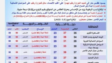 تتأهب مصر لمواجهة موجة حارة شديدة خلال الـ 48 ساعة القادمة، حيث كشفت الهيئة العامة للأرصاد الجوية عن توقعات بارتفاع…
