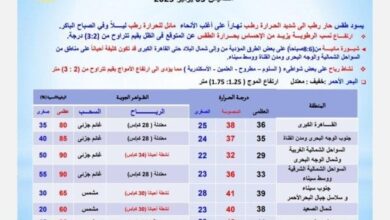 تشهد البلاد اليوم الأربعاء، حالة طقس متباينة بين شديد الحرارة ورطب على أغلب الأنحاء، مع توقعات بهطول أمطار رعدية على…