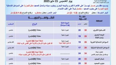 تشهد مصر اليوم الخميس 15 مايو 2025 طقسًا حارًا نهارًا على أغلب المناطق، في حين تظهر شبورة مائية صباحًا، وتنشط…